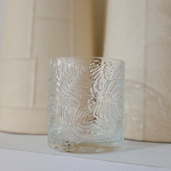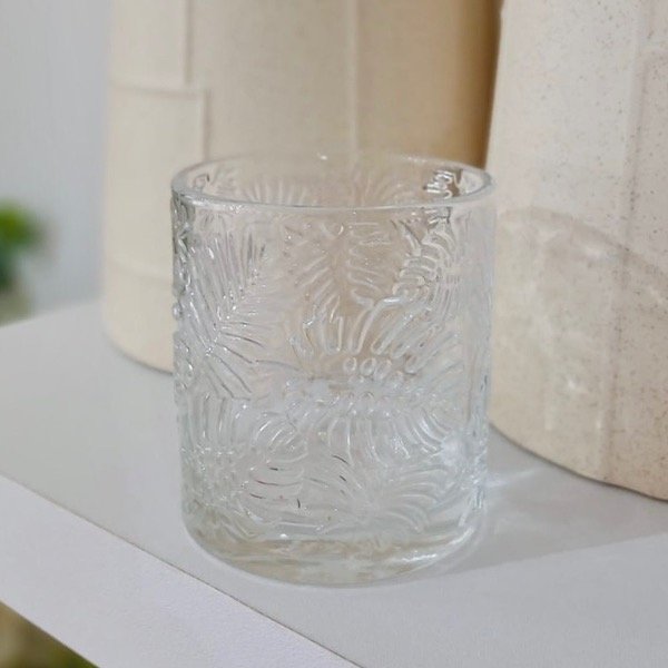 Este porta velas de vidrio con forma de vaso labrado combina diseño simple y materiales resistentes para dar un toque cálido y decorativo a tu hogar.
