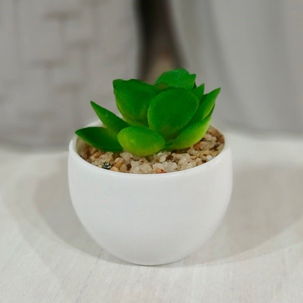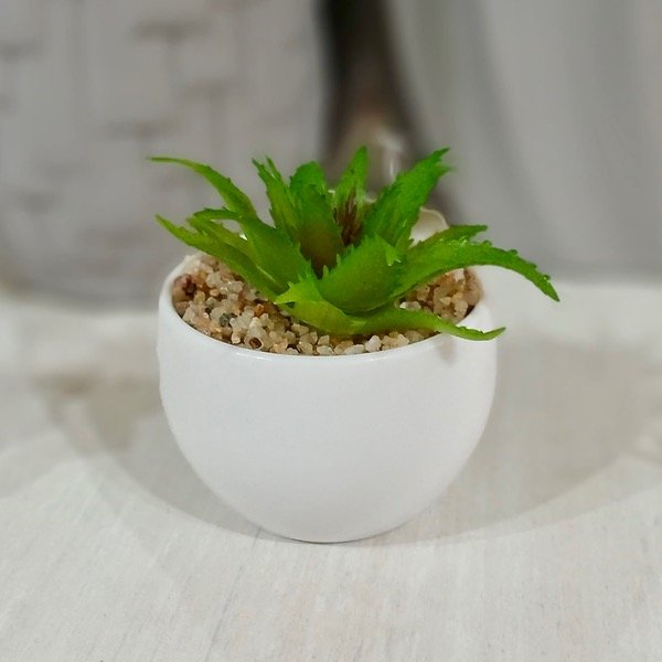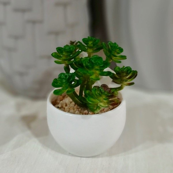 Esta suculenta artificial con base blanca es ideal para decorar escritorios, estantes, mesas o cualquier rincón de tu casa u oficina. Realista, liviana y fácil de ubicar.