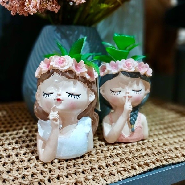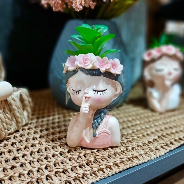 Esta suculenta artificial con maceta de mujer es ideal para decorar escritorios, estantes, mesas o cualquier rincón de tu casa u oficina. Realista, liviana y fácil de ubicar.