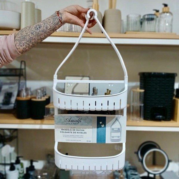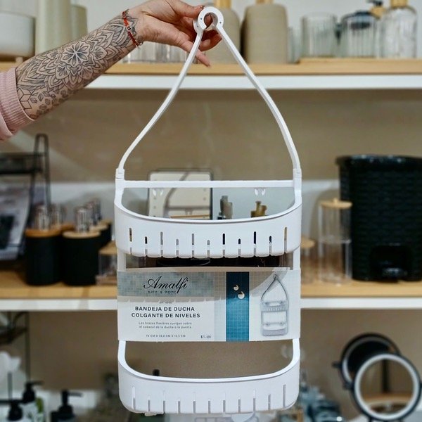 Ordená tu baño con este organizador de ducha 2 niveles, que incluye ganchos para colgar esponjas, cepillos o accesorios.