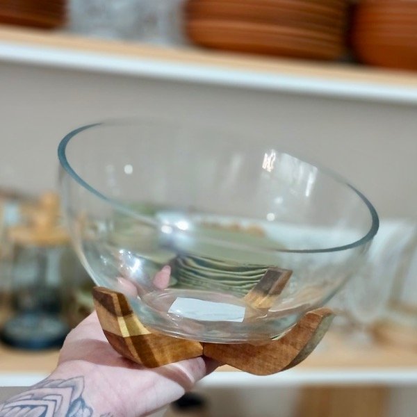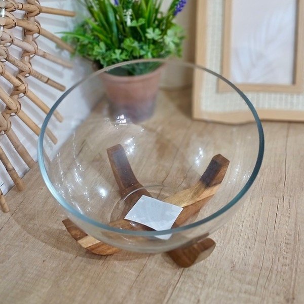 Este bowl de vidrio con base de madera es ideal para servir o transportar tus preparaciones de forma segura y con estilo.