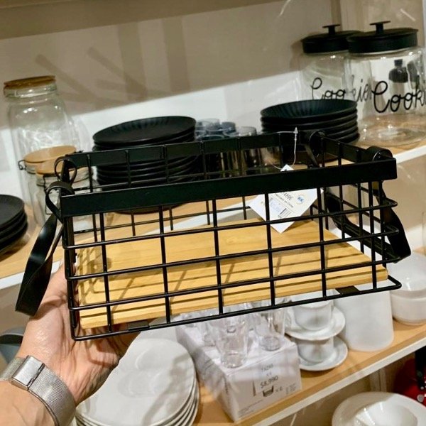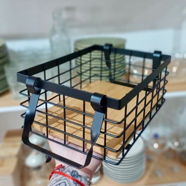 Esta canasta organizadora rectangular en hierro y madera es perfecta para mantener todo en orden sin perder estética.